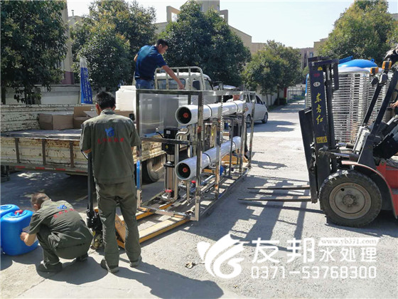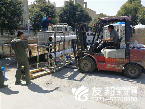 這套型號為YB-CJS-005,每小時出水5噸的單級水處理設備是發(fā)往新鄉(xiāng)的,工人們冒著炎炎夏日正在裝車發(fā)貨。
