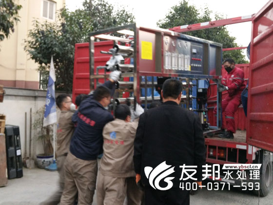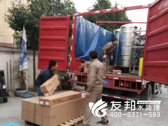 師傅們正在裝車發貨的是鄭州友邦生產的型號為YB-CJS-002的2噸純凈水設備。這套設備是用在鄭州高新區機械廠的生產用水。